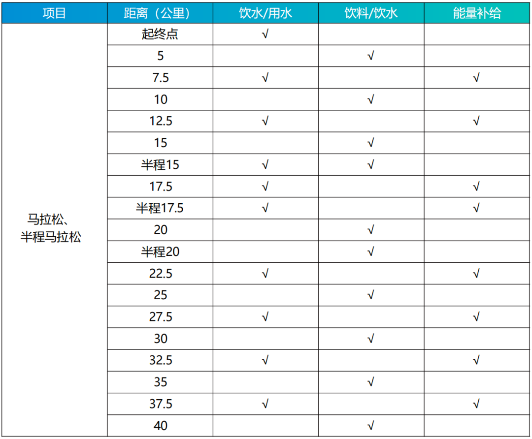2.能量补给站:在比赛沿途的7.5公里、12.5公里、17.5公里、22.5公里、27.5公里、32.5公里、37.5公里以及半程和全程终点处设置能量补给站。