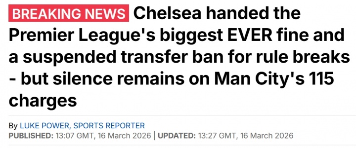 03月16日讯 英超官方发布公告,切尔西就历史财务违规问题与英足总达成和解,被罚款1075万英镑,青训队禁止转会9个月,一线队转会禁令一年,缓期两年执行。英媒《每日邮报》跟进报道,表示切尔西本次罚款金额创造了英超历史新高,此前英超开出的最高罚单是西汉姆联在2007年被罚550万英镑。此前西汉姆联违规签下了特维斯以及马斯切拉诺。同时报道还表示,曼城此前遭到11...