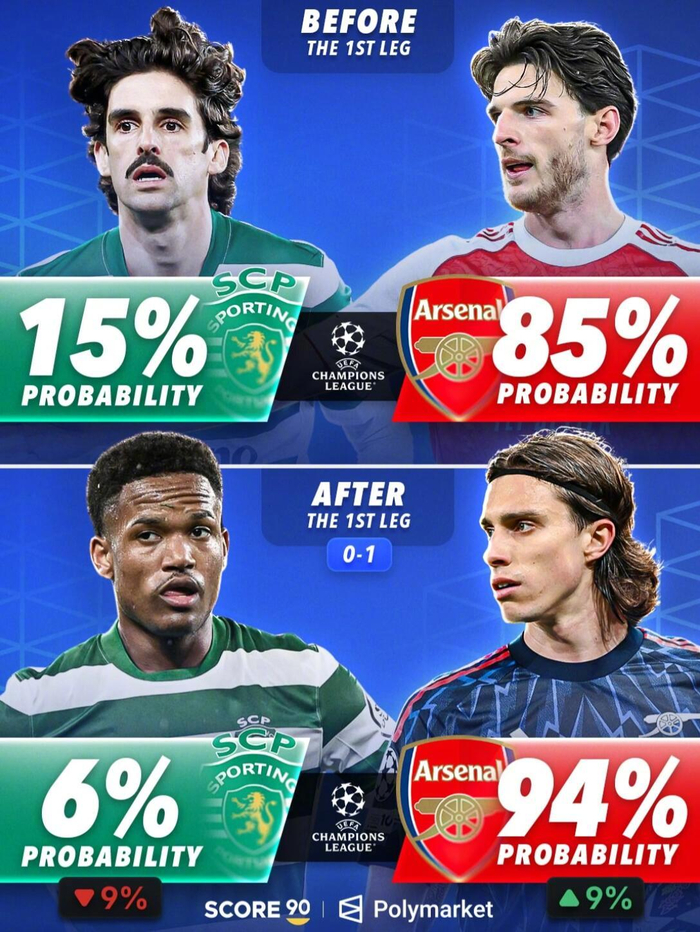 #欧冠[超话]# 欧冠淘汰赛首回合战罢,相关预测平台也更新了各队的晋级概率。根据Score90援引Polymarket给出的最新数据,拜仁和阿森纳都在首回合赢球后进一步占据晋级主动。在皇马与拜仁的对决中,拜仁首回合客场2比1取胜后,晋级半决赛的概率从赛前的66%上升至84%,提升了18个百分点;皇马则从34%下降至16%,次回合将面临更大压力。另一组对决中...