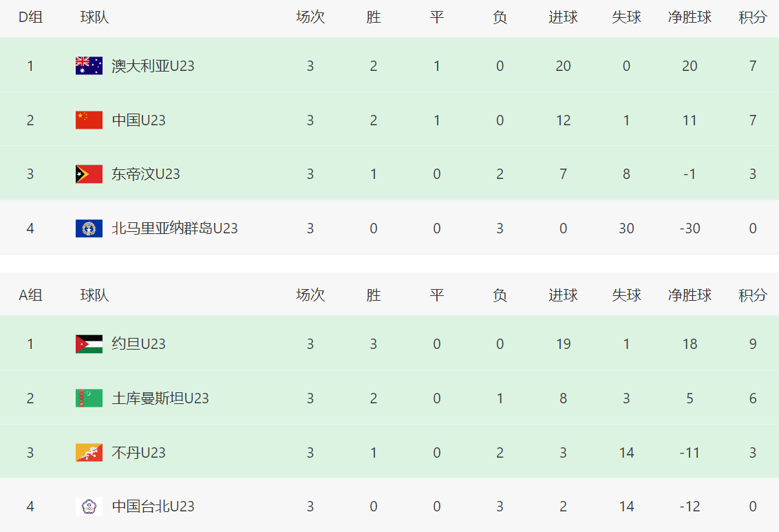从以上积分榜来看,中国队7分且11个净胜球,高居所有小组第二名的首位。其实,即便中国队小比分输给澳大利亚队,也能成为其中一个成绩最好的小组第二,拿到晋级资格,因为只有2支积7分球队。