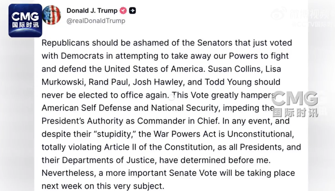 只有少数共和党议员对这次突袭行动表示谴责。前参议院多数党领袖米奇·麦康奈尔虽非特朗普盟友,也对这次军事行动表示肯定。“让美国再次伟大”(MAGA)阵营的大部分成员似乎都选择了支持,一贯倡导“美国优先”议程的前特朗普顾问史蒂夫·班农称这是一次“大胆而出色的突袭”。