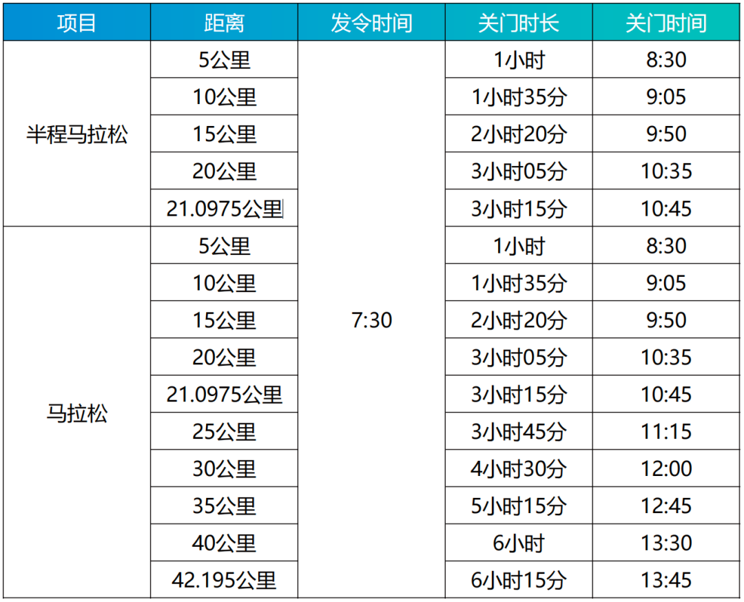 2.比赛当天起点存衣服务将于7:15截止,请选手做好时间安排。半程马拉松选手在比赛当日11:30前,马拉松选手在14:30前到指定存衣处领取个人存放物品。